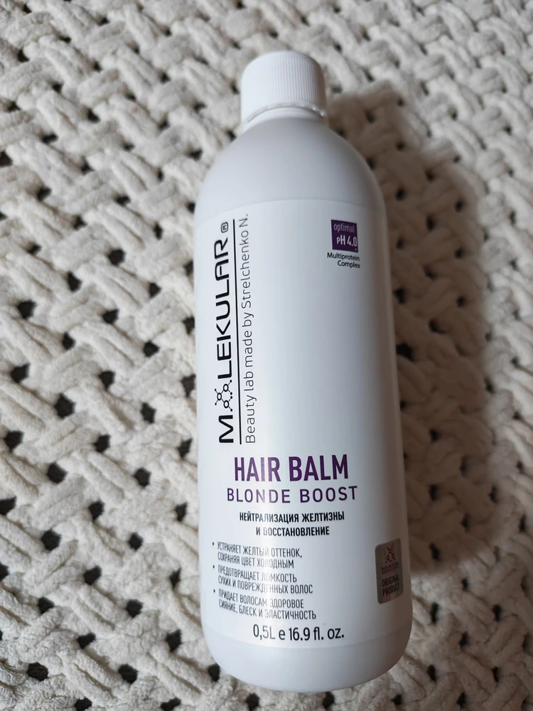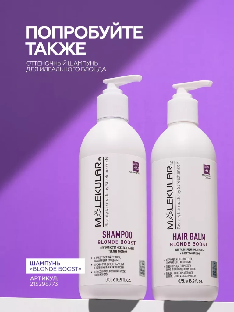 Blonde Boost — это оттеночный бальзам для ухода за осветленными волосами холодных тонов, обеспечивающий комплексное воздействие. Он успешно устраняет желтизну, сохраняя холодный блонд, и одновременно глубоко увлажняет и разглаживает волосы, предотвращая их электризацию. Бальзам не содержит аммиак и перекись водорода. Для профессионального использования: Высокая концентрация оттеночных пигментов — нейтрализует нежелательные желтые или медные оттенки, усиливая светлые тона, не делая волосы фиолетовыми. Hydrolyzed keratin — один из самых эффективных компонентов в борьбе за красоту волос. Основная польза заключается в способности молекулы кератина проникать в глубь волоса и заполнять его, улучшая структуру изнутри. Как результат, поврежденные волосы восстанавливаются, повышается эластичность и прочность. Также кератин защищает волосы от пагубного воздействия внешней среды. Hydrolyzed Silk — способствует восстановлению волос, укрепляя их структуру. Обладает высокой питательной и увлажняющей способностью. Благодаря антиоксидантным свойствам, защищает волосы от повреждений, вызванных свободными радикалами. Chitosan — природный полимер, который образует защитную пленку на всех волосках, предохраняя от потери влаги и оберегая их от негативного влияния окружающей среды. Кондиционирующие агенты — смягчающие и антистатические добавки для обеспечения наилучшей степени кондиционирования волос, снятия статического электричества, придания волосам гладкости, блеска, легкого расчесывания. Способ применения: после использования шампуня промокните волосы полотенцем. Распределите бальзам по всей длине волос, не затрагивая корни. Оставьте на 1-5 минут в зависимости от желаемой интенсивности эффекта. Смойте большим количеством теплой воды. Рекомендуем проводить процедуру в одноразовых перчатках. При использовании фиолетового бальзама рекомендуем применять шампунь, не имеющий оттеночных свойств.
