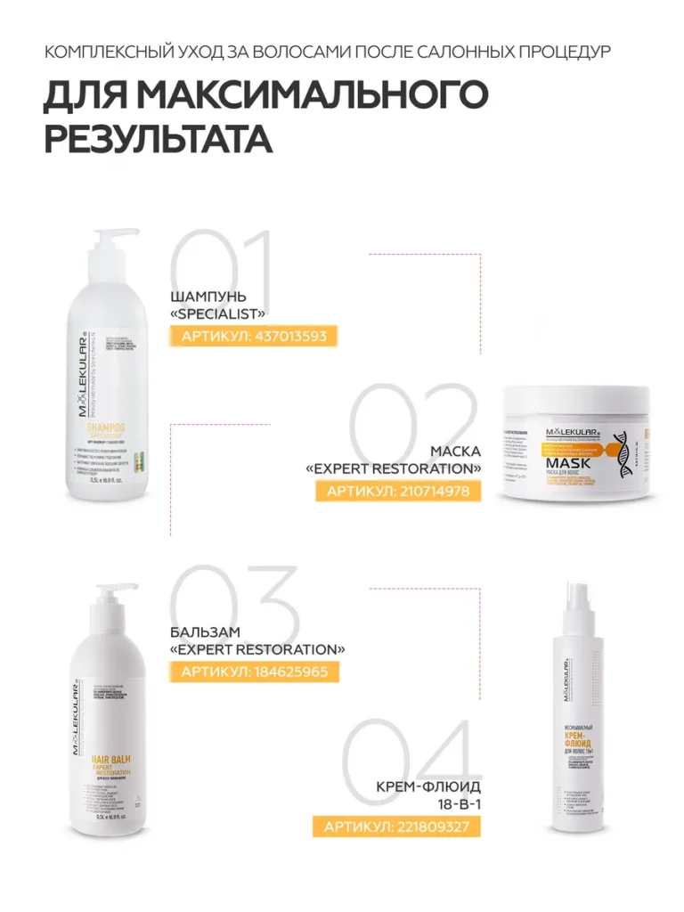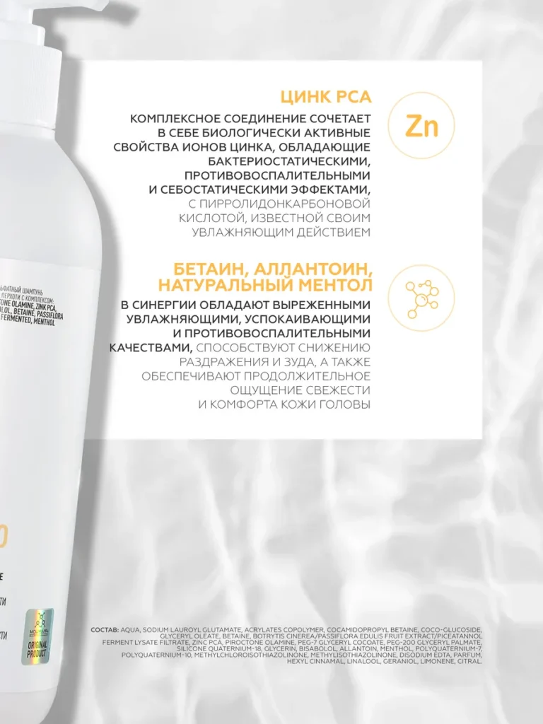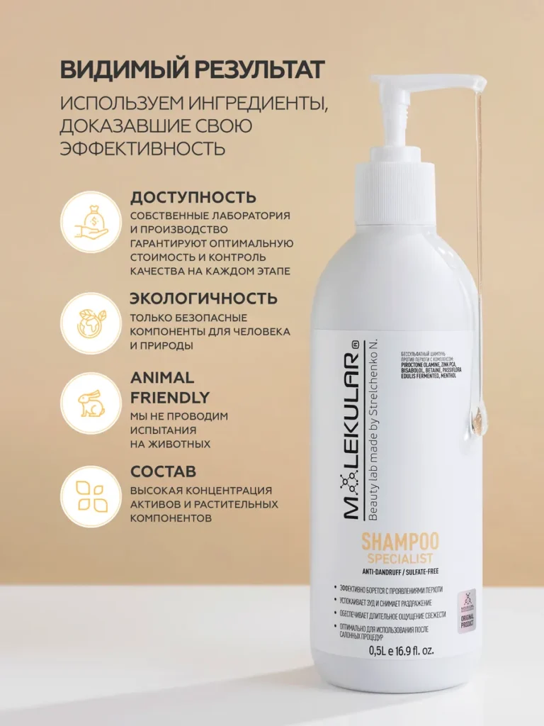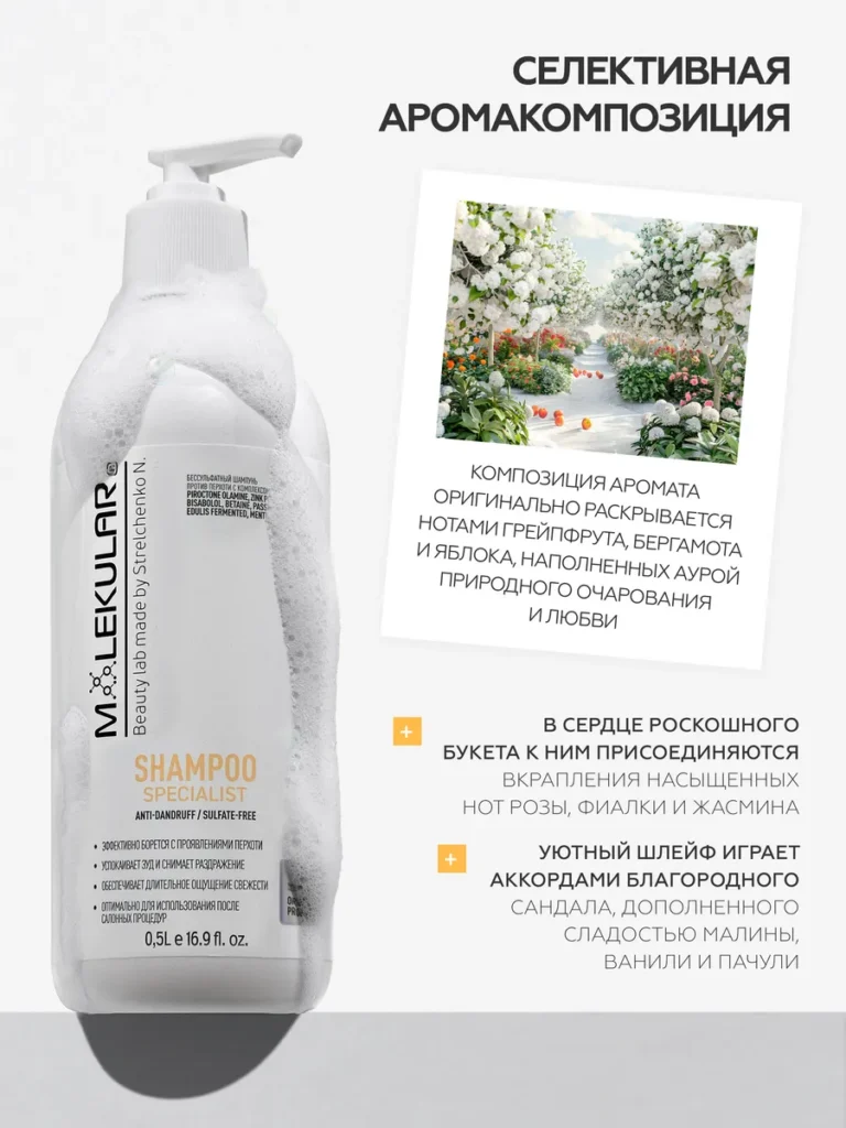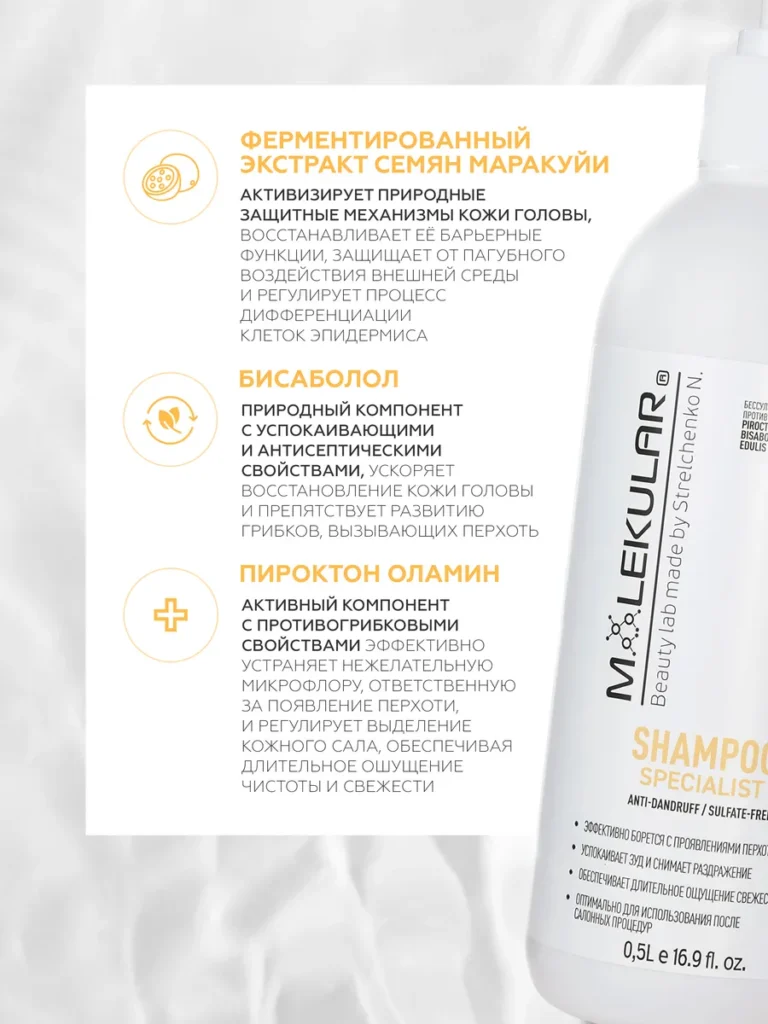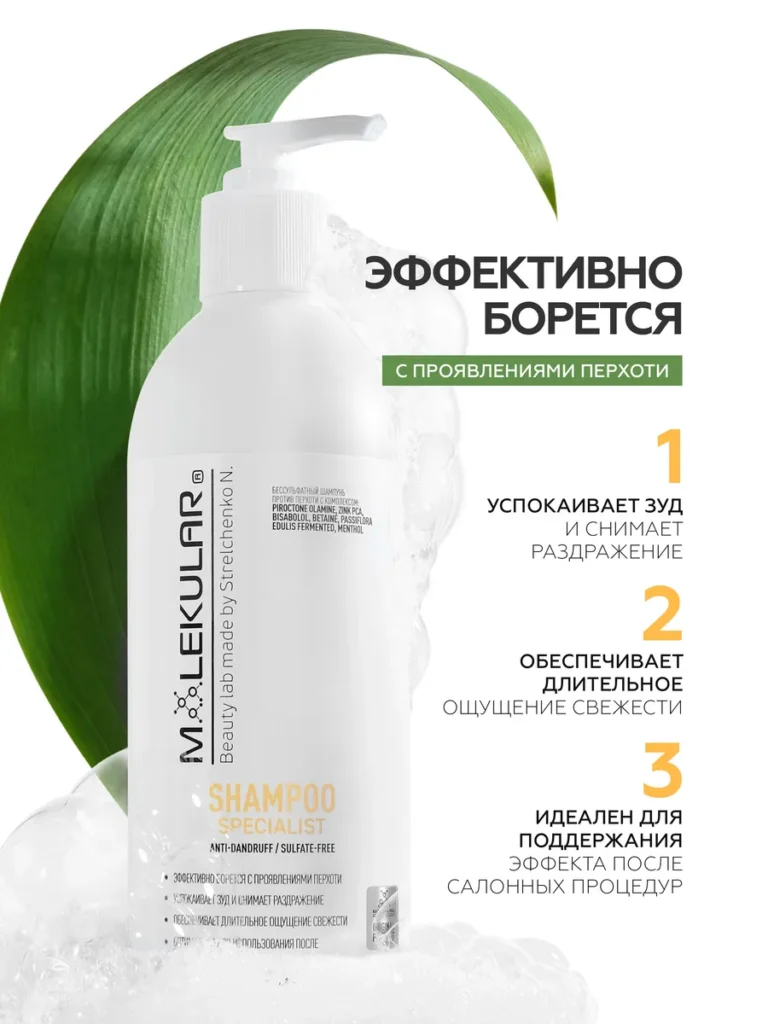 100% бессульфатный профессиональный шампунь против перхоти – забота о здоровье кожи головы и ваших волос. Сделайте шаг навстречу здоровью и красоте ваших волос с профессиональным бессульфатным шампунем, разработанным для деликатного очищения и эффективной борьбы с перхотью. Уникальная формула на основе ферментированного комплекса семян маракуйи, пироктон оламина, цинка PCA, бисаболола, бетаина, аллантоина и натурального ментола мягко, но интенсивно очищает кожу головы, устраняя зуд и дискомфорт. Шампунь не просто борется с симптомами – он воздействует на первопричины, устраняя вредный микробиом, вызывающий перхоть, и восстанавливая естественное здоровье кожи головы. Бессульфатная формула идеально подходит даже для чувствительной кожи, не пересушивая волосы и сохраняя их мягкость и блеск. Шампунь прекрасно подходит для ухода за волосами после салонных процедур, помогая продлить их эффект и обеспечивая мягкий профессиональный уход – прямо у вас дома! Здоровая кожа головы, красивые волосы и никакой перхоти – вместе c шампунем SPECIALIST от MOLECULAR вы навсегда забудете о дискомфорте. Попробуйте – и ощутите разницу уже после первого применения!