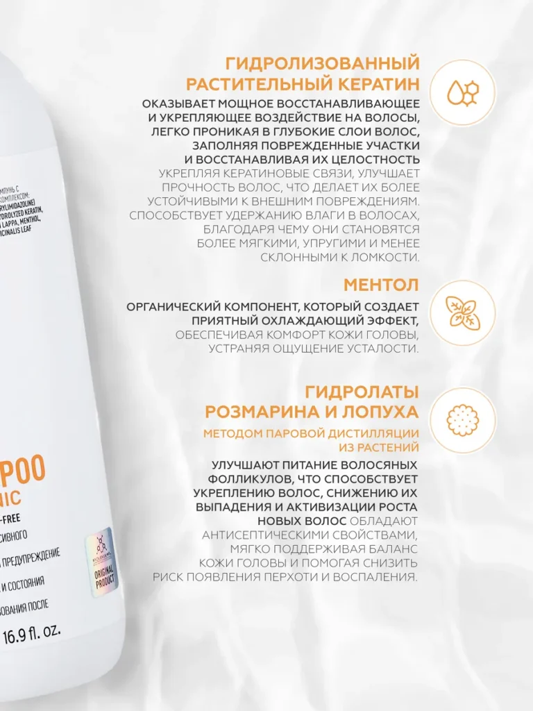 Профессиональный бессульфатный шампунь с высоким содержанием гидролизованного кератина, KeraDyn, натурального бетаина, ментола, гидролатов розмарина и лопуха — это идеальное решение для деликатного ухода за кожей головы и волосами. Специально разработанная формула обеспечивает бережное очищение, сохраняя здоровье кожи головы, укрепляя структуру волос и обеспечивая интенсивное восстановление. Бессульфатный шампунь идеально подходит для ухода после кератинового выпрямления и процедуры ботокса для волос, способствуя сохранению гладкости, блеска и профессионального эффекта. Гидролизованный кератин в составе шампуня эффективно восстанавливает поврежденные участки волос, придавая им силы и эластичности. Активный компонент KeraDyn помогает улучшить текстуру волос, предотвращая ломкость и сухость, а натуральный бетаин и экстракты розмарина и лопуха питают и увлажняют кожу головы, обеспечивая длительное ощущение свежести. Ментол освежает, стимулируя кровообращение, что способствует укреплению корней и активному росту волос. Шампунь идеально подходит для регулярного использования после процедуры кератинового выпрямления, сохраняя эффект гладкости и шелковистости. Он также рекомендован для ухода после ботокса для волос, так как помогает сохранять прочность и упругость локонов, продлевает эффект салонных процедур и поддерживает их результат в домашних условиях. Этот продукт — незаменимый помощник в восстановлении, защите и интенсивном уходе за вашими волосами.