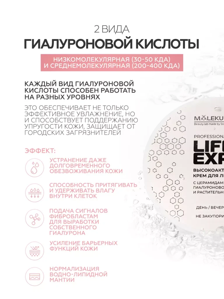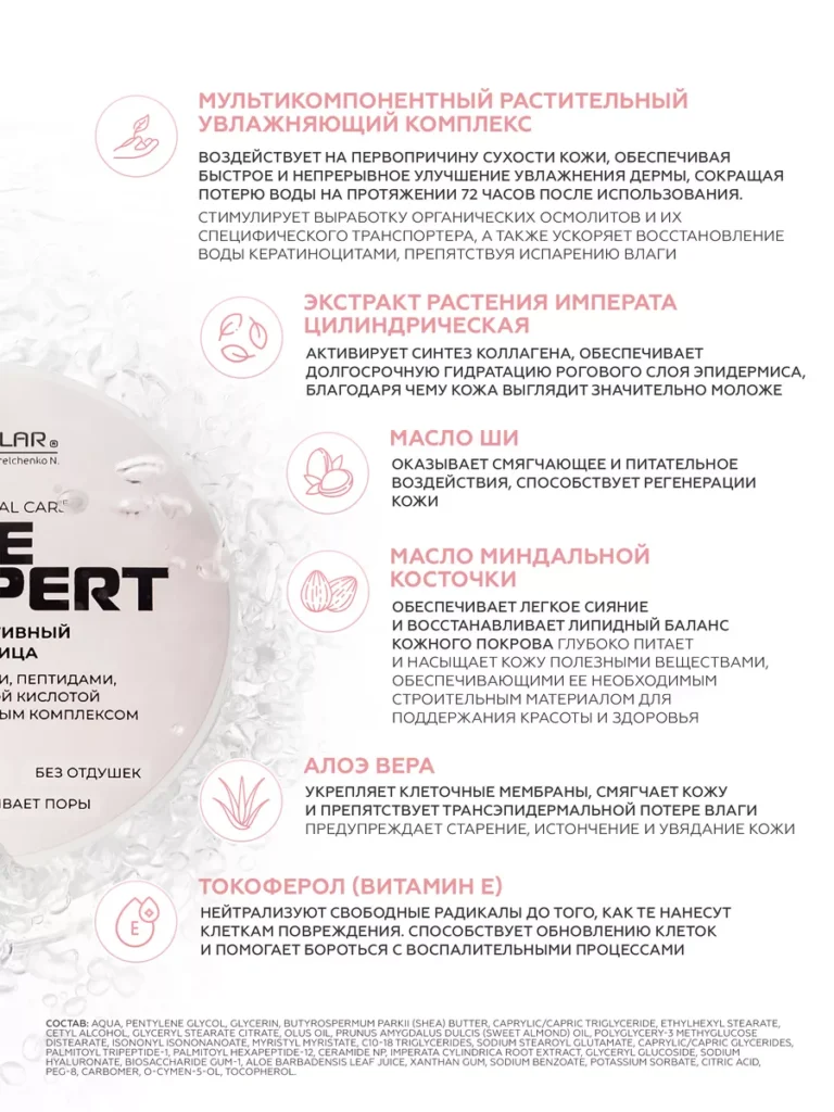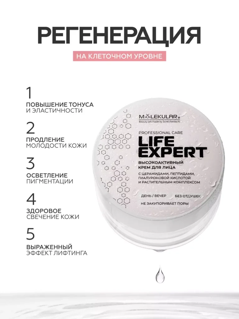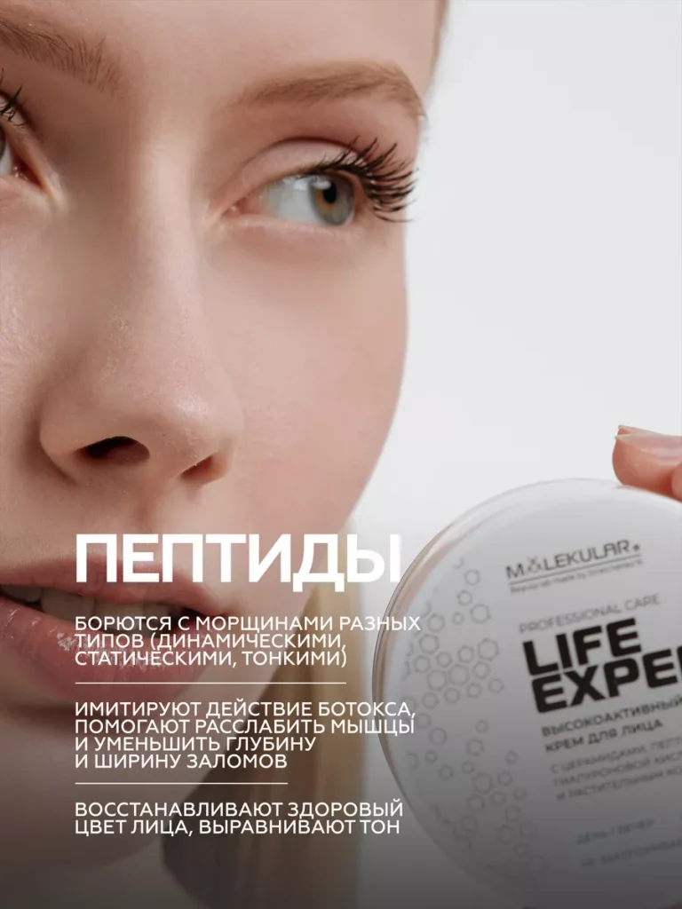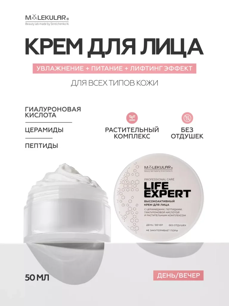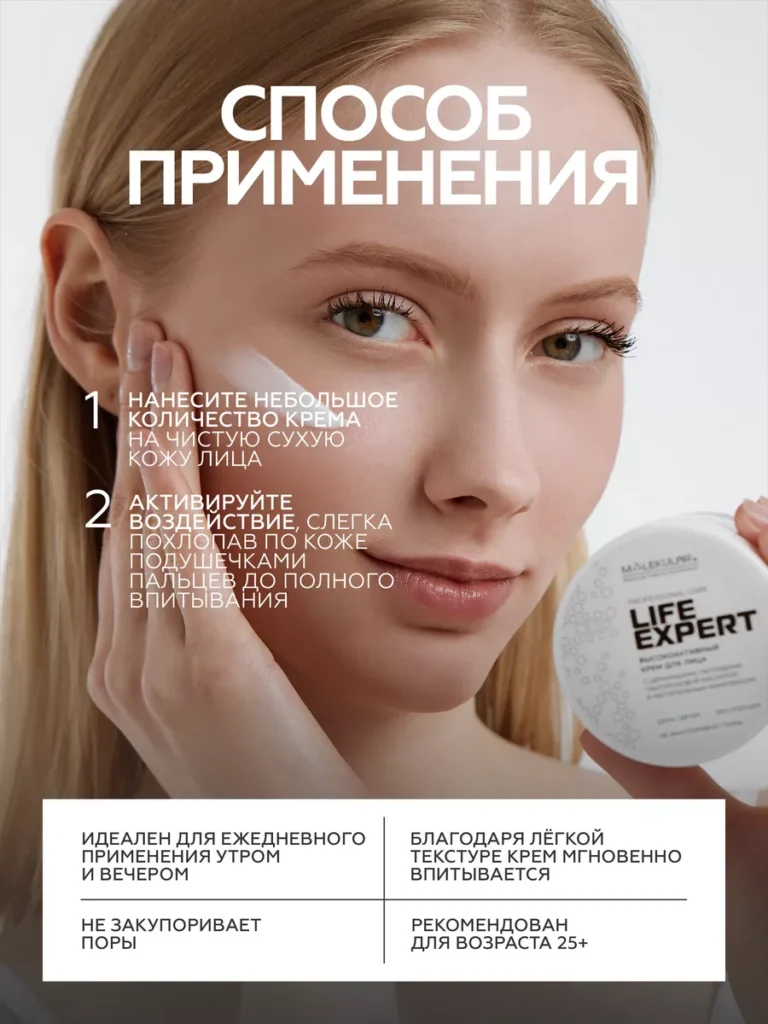Высокоактивный крем для лица — Life Expert Крем для лица с пептидами, церамидами, двумя видами гиалуроновой кислоты и мультикомпонентным растительным увлажняющим комплексом. Синергия активных компонентов для полноценного ухода. Благодаря уникальной формуле, крем оказывает превентивное действие против появления морщин и пигментации, замедляет процесс возрастного изменения кожи, активирует механизм восстановления коллагена и эластина, увеличивает количество необходимой влаги и задерживает ее в эпидермисе, поддерживает защитный липидный барьер кожи. Способ Применения: ежедневно утром и вечером наносить небольшое количество крема на чистую сухую кожу лица.