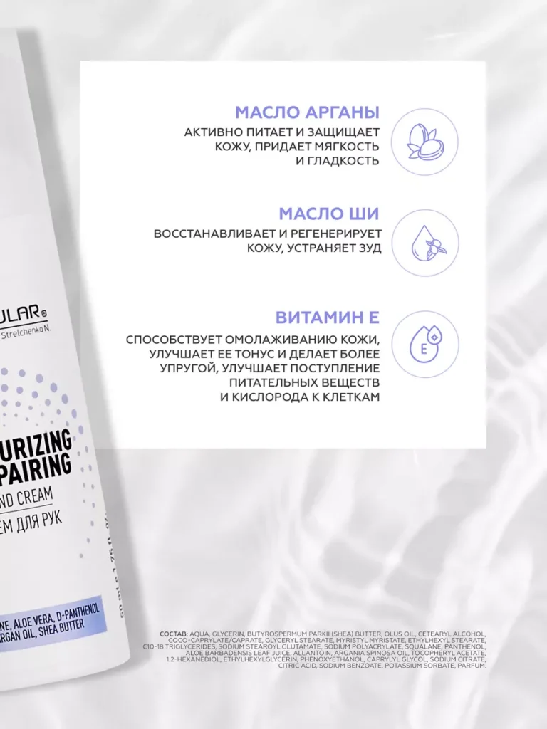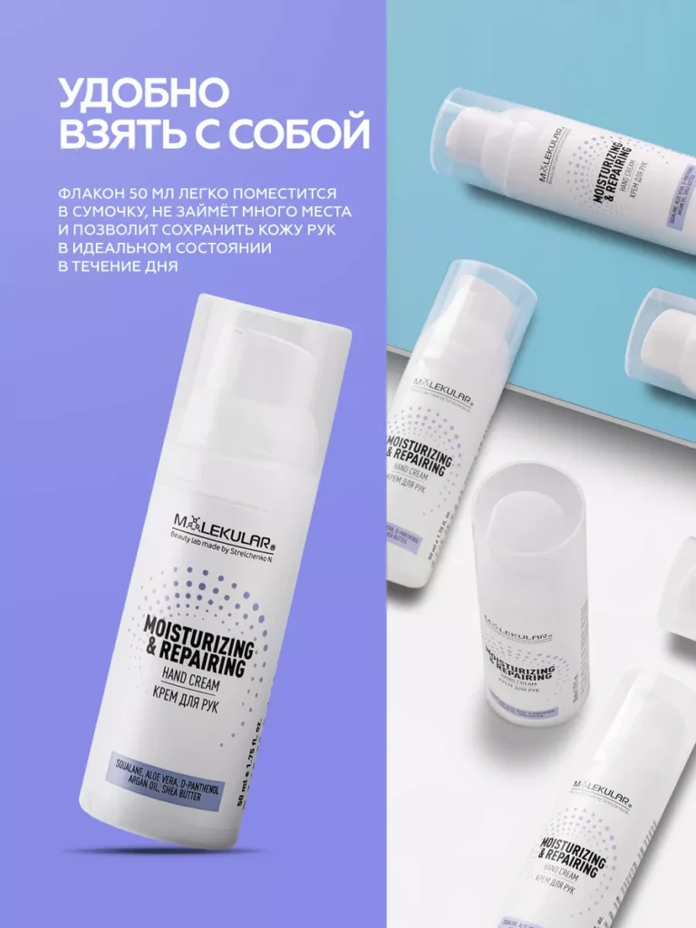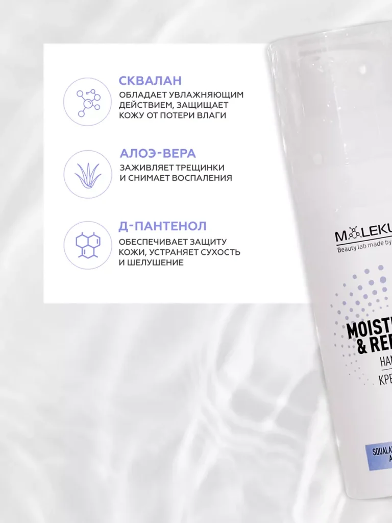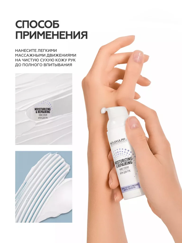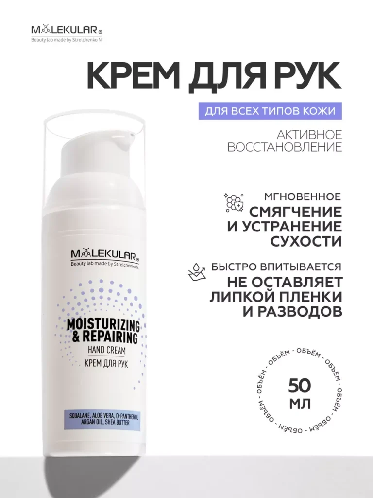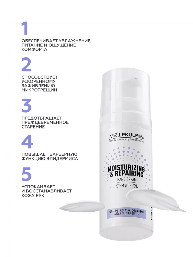 Крем MOLEKULAR для рук — отличное средство для людей, желающих сохранить ухоженность рук и их здоровье. Этот увлажняющий продукт широко действует, способствуя избавлению от сухости и шелушения кожи. Благодаря своей новаторской формуле, он активно способствует восстановлению кожи, ускоряет заживление микротрещин и питает ее полезными компонентами. Уникальный комплекс активных веществ, включающий сквалан, алоэ вера, Д-пантенол, масло арганы, масло ши и витамин Е, глубоко проникает в клетки кожи, укрепляет естественный защитный слой и способствует более эффективному удержанию влаги. Кроме того, данный продукт обладает приятным запахом и быстрым впитыванием, не оставляя жирности на коже. Он прекрасно подходит для повседневного ухода за руками и помогает сохранить их молодость и красоту на протяжении долгого времени. Не упустите возможность заказать этот уникальный крем для сухих рук, который станет надежным союзником в решении проблем кожи. Позаботьтесь о состоянии своих рук у