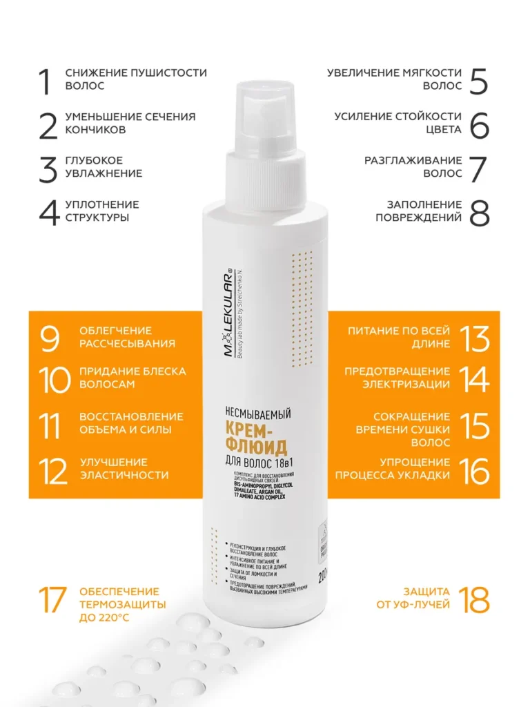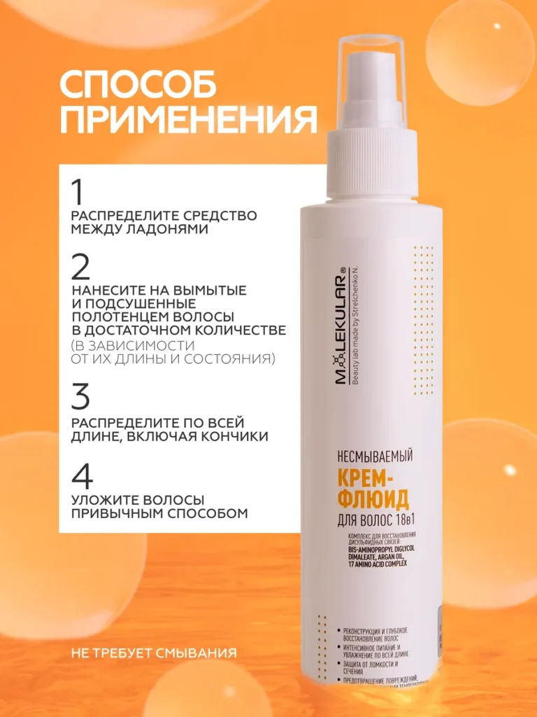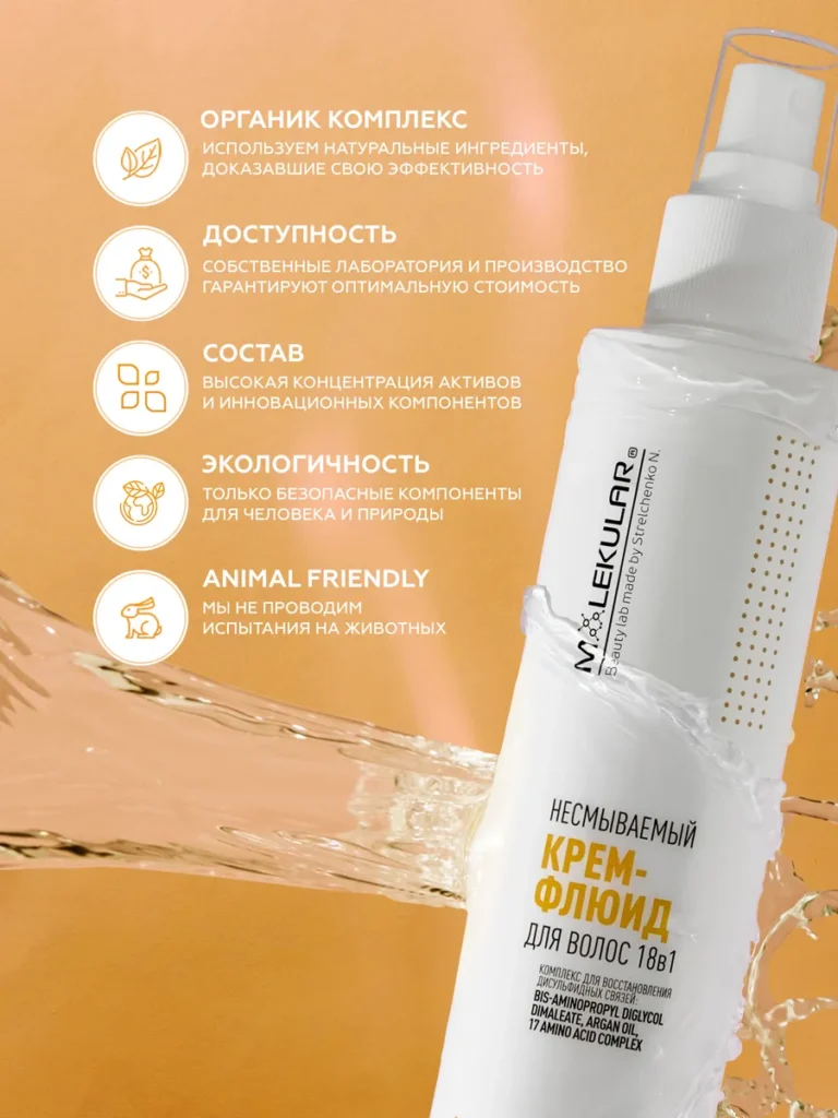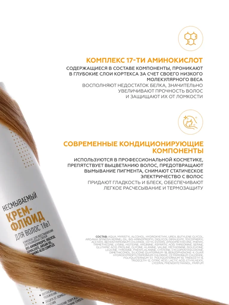 Крем-Флюид для волос 18в1 на основе комплекса BADD, арганового масла и аминокислот – универсальное средство, не требующее смывания.