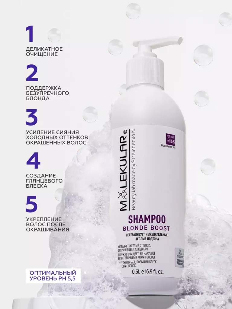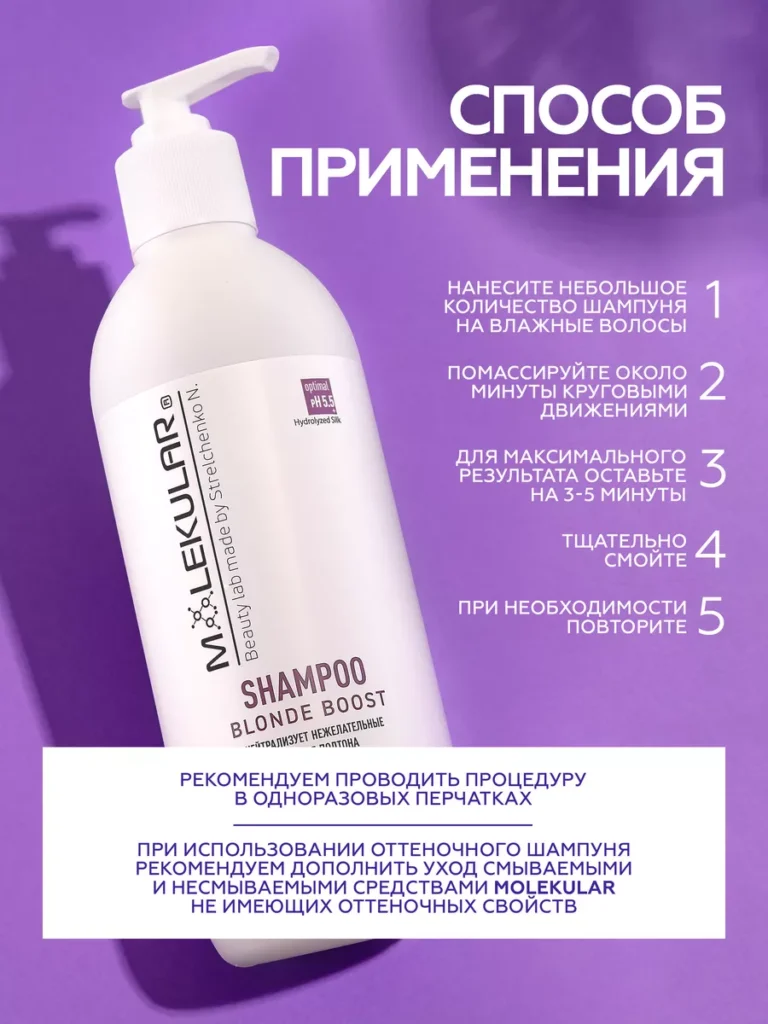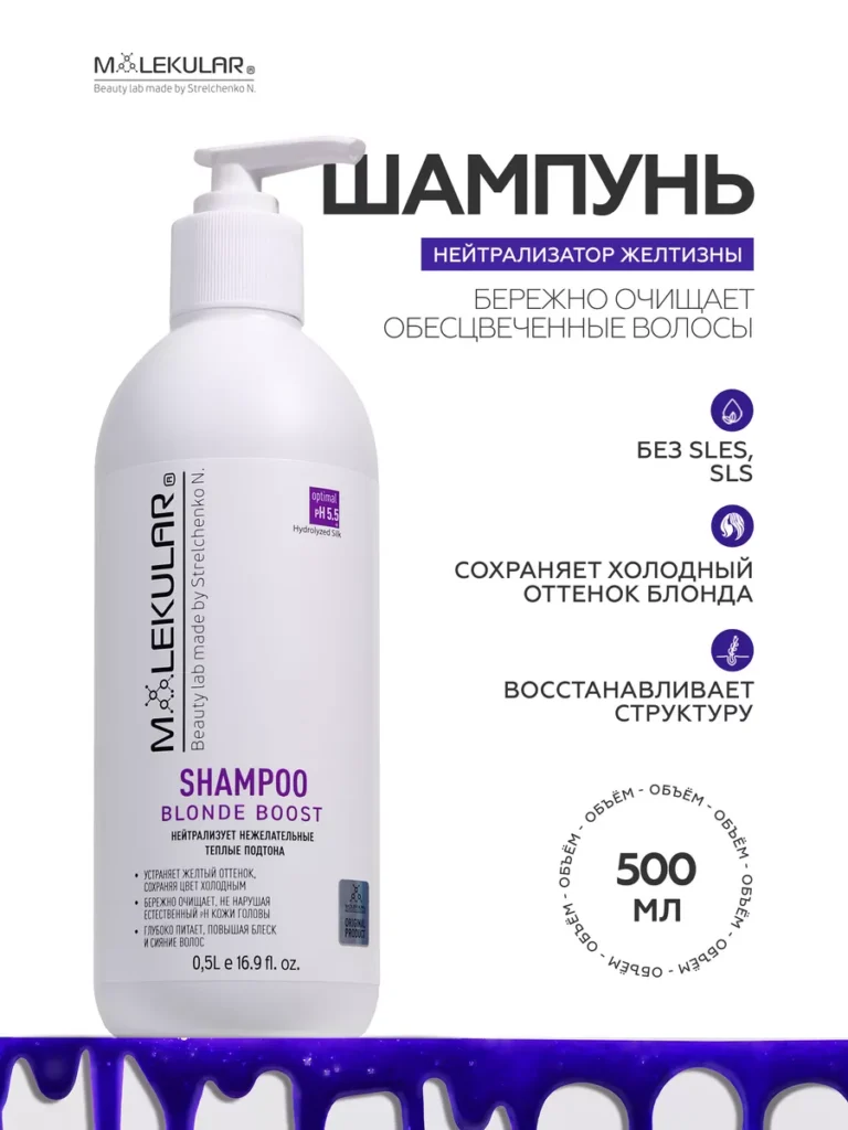 Шампунь Blonde Boost для светлых волос Безопасный шампунь без SLES и SLS с уникальным набором фиолетовых пигментов, созданный для сохранения прохладных оттенков блонд и устранения нежелательной желтизны. Благодаря деликатному составу и правильному уровню кислотности 5.5, продукт бережно очищает волосы, сохраняя естественное здоровье кожи головы. Для профессионального использования: Высокая концентрация оттеночных пигментов — нейтрализует нежелательные желтые или медные оттенки, усиливая светлые тона, не делая волосы фиолетовыми. Hydrolyzed Silk — способствует восстановлению волос, укрепляя их структуру. Обладает высокой питательной и увлажняющей способностью. Благодаря антиоксидантным свойствам, защищает волосы от повреждений, вызванных свободными радикалами. Поверхностно-активные вещества из сырья растительного происхождения — мягко очищают волосы и кожу головы, усиливают липидный слой и увлажняют кожу, обеспечивают распутывание влажных волос, эффективно придают объем и блеск. Acrylates copolymer — безопасный синтетический гелеобразователь. Смываемый, не впитывается кожей. Современный компонент для профессиональной косметики, позволяющий не использовать раздражающие кожу загустители. Сохраняет влагу в локонах, препятствует их ломкости. Кондиционирующие агенты — смягчающие и антистатические добавки для обеспечения наилучшей степени кондиционирования волос, снятия статического электричества, придания волосам гладкости, блеска, легкого расчесывания. СПОСОБ ПРИМЕНЕНИЯ: нанесите небольшое количество шампуня на влажные волосы. Помассируйте около минуты круговыми движениями. Для максимального результата оставьте на 2-3 минуты, затем тщательно смойте. При необходимости повторить. Рекомендуем проводить процедуру в одноразовых перчатках. При использовании фиолетового шампуня рекомендуем дополнять уход смываемыми и несмываемыми средствами не имеющих оттеночных свойств.