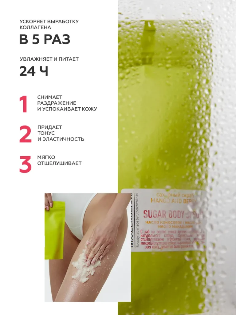 Хорошо скрабирует, увлажняет и питает. То что было нужно👍🏼 после первого применения когда напитанная и супер гладкая😍 Аромат клубники просто вау👍🏼