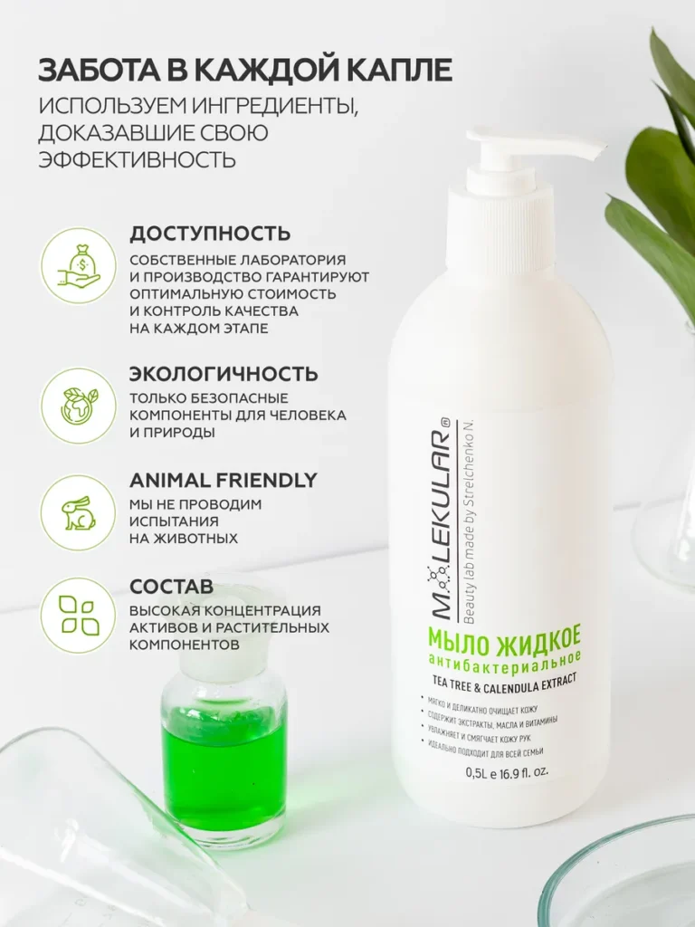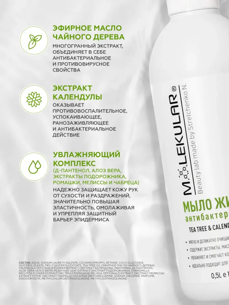 НЕ СОДЕРЖИТ: парабены, формальдегиды, фталаты, триклозан, краситель. Уникальная формула очищения, обогащенная эфирным маслом чайного дерева и экстрактом календулы, эффективно и бережно удаляет до 99.9% распространенных вирусов и бактерий. Действенный увлажняющий комплекс, содержащий Д-Пантенол, Алоэ Вера, а также экстракты Подорожника, Ромашки, Мелиссы и Чабреца, надежно защищает кожу рук от обезвоживания и раздражения, значительно повышая ее эластичность, омолаживая и способствуя заживлению поверхности кожи. Способ применения: нанести небольшое количество жидкого мыла на влажную кожу, вспенить. Затем смыть проточной водой. При необходимости процедуру повторить. Состав (inci): Aqua, Sodium Laureth Sulfate, CocamidopropylBetaine, Coco Glucoside, Glyceryl Oleate, PEG-7 Glyceryl Cocoate, Tea Tree Oil (Эфирное масло чайного дерева), Calendula Officinalis Flower Extract (Экстракт календулы), Panthenol (Д-Пантенол), AloeVera (Алоэ Вера), Plantago Leaf Extract (Экстракт подорожника), Chamomilla Recutita Flower Extract (Экстракт ромашки), Melissa Officinalis Extract (Экстракт Мелиссы), Extract Thyme (Экстракт Чабреца), Cocamide Diethanolamine, Sodium Chloride, Parfume, Disodium Edta, Methylchloroisothiazolinone, Methylisothiazolinone.